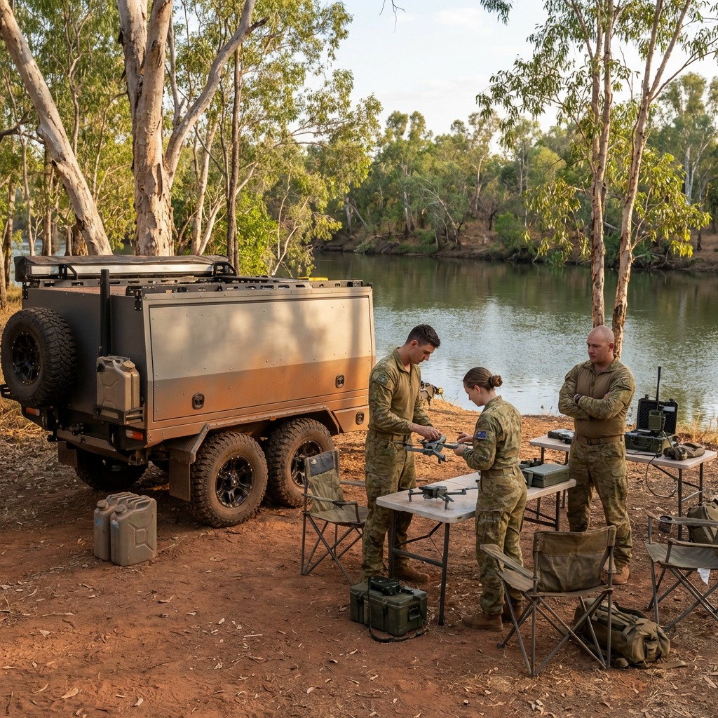 The Military UAV Operations Trailer is designed to extend the operational capability of a three-person agile field manoeuvre team by providing a highly mobile platform for an electrified multi-copter Intelligence, Surveillance and Reconnaissance (ISR) system.