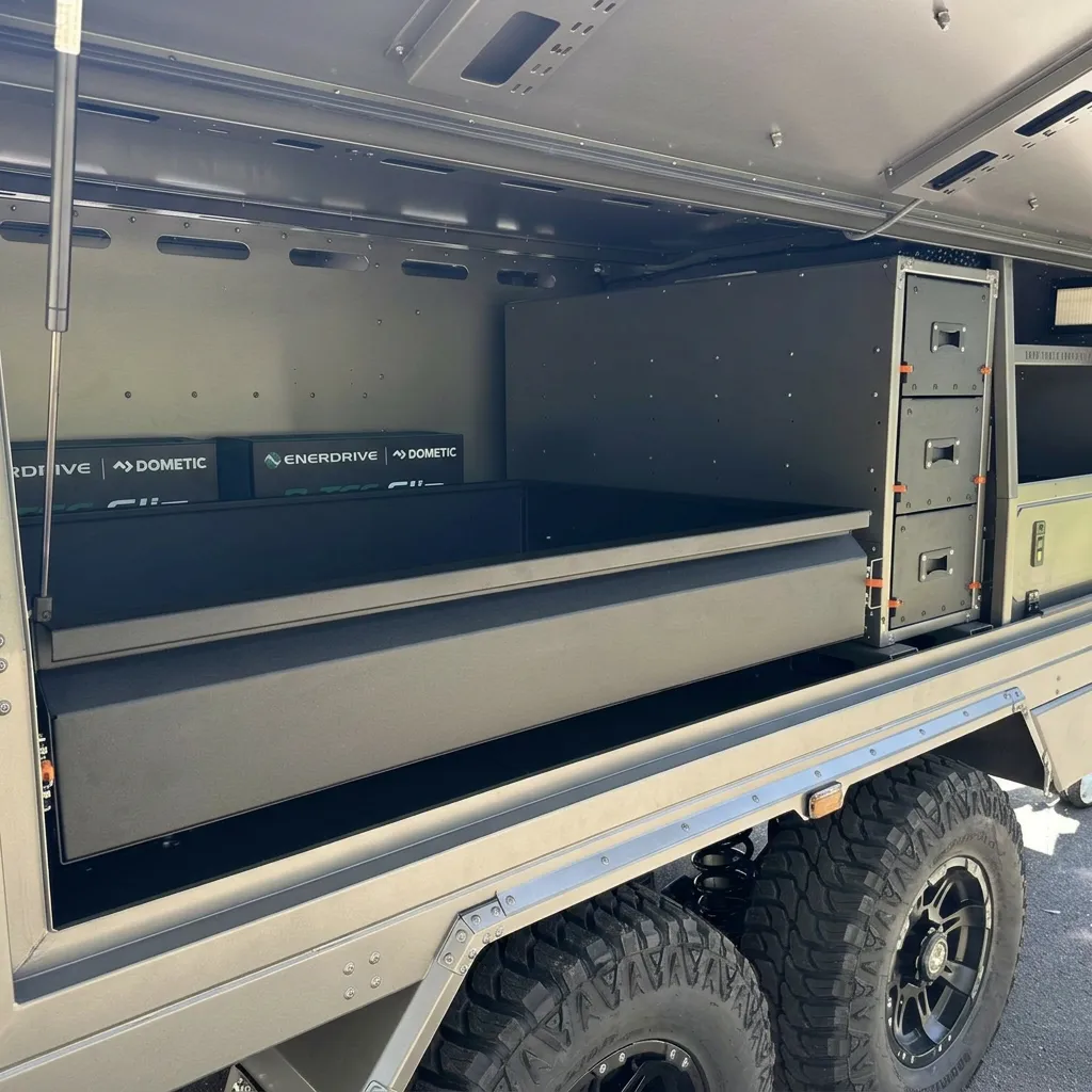 Our Off Road Trailers are significantly different to most other off road trailers on the market. They have been specifically designed and engineered to handle rugged off-road conditions. Unlike other Surveillance trailers that may struggle in rough terrain. These trailers are built with high-quality materials and equipped with features like reinforced chassis bracing, heavy-duty independent military suspension systems and large off-road tires to provide maximum stability and braking power. Land Force Defence trailers feature unique and innovative design elements such as extra storage space, customizable interior layouts, and 2 different interchangeable body options. All of these factors set our Off Road Trailers apart from the competition and make them ideal for customers who demand the toughest and the best.
